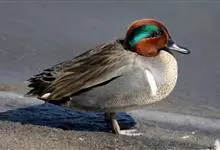 绿翅鸭是小型鸭类,体长37厘米,体重约0.5千克。嘴脚均为黑色。雄鸟头至颈部深栗色,头顶两侧从眼开始有一条宽阔的绿色带斑一直延伸至颈侧,尾下覆羽黑色,两侧各有一黄色三角形斑,在水中游泳时,极为醒目。…全部>>
