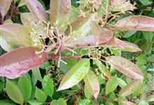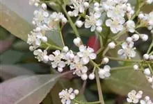 石楠 Kalkman),是蔷薇科石楠属的常绿乔木,高5~12米,株型紧凑,树冠圆球形。树枝为褐灰色;鳞片为褐色,没有毛;叶片革质,长椭圆至侧卵状椭圆形,有锯齿,新叶红色光亮。复伞房花序,白色小花,…全部>>