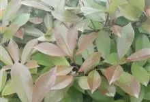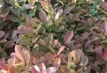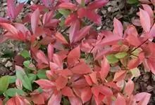 红叶石楠 是蔷薇科,石楠属杂交种,为常绿小乔木或灌木,乔木高可达5米、灌木高可达2米。叶片革质,长圆形至倒卵状、披针形,叶端渐尖,叶基楔形,叶缘有带腺的锯齿,花多而密,复伞房花序,花白色,梨果黄红色,…全部>>