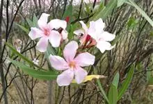 白花夹竹桃是夹竹桃科、夹竹桃属植物夹竹桃的栽培品种。常绿直立大灌木,枝条灰绿色;嫩枝条具稜,被微毛,老时毛脱落。叶3-4枚轮生,下枝为对生,叶面深绿,叶背浅绿色;侧脉纤细平行与中脉成直角;叶柄扁平,…全部>>