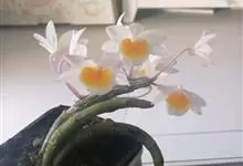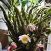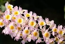 玫瑰石斛是兰科石斛属的多年生附生草本植物。茎斜下或下垂,青绿色,圆柱形,节间鞘具绿或白色相间的条纹;叶窄披针形;花序短,生于已落叶的老茎上部,花序梗长,萼片和花瓣白色,上部带淡紫色,干后蜡质状,…全部>>