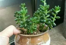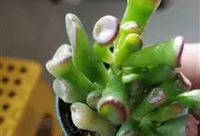 筒叶花月,是景天科青锁龙属的多年生草本植物。植株多分株,灌木状,茎较粗壮,圆柱形,表皮灰褐色;叶片肉质,互生,呈圆筒状,簇生于茎或分枝顶端,叶端呈斜截形,截面为椭圆形;花呈星状,淡白色;花期秋季。…全部>>