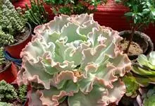 女王花笠,又名扇贝石莲花、女王花舞笠,是景天科拟石莲花属的多肉植物。由美国加利福尼亚州的育种师Dick Wright于1964年培育。特征是呈大波浪状褶皱的红色叶缘和气质高贵的粉紫色调。…全部>>