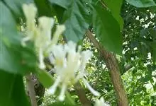 山银花在华南地区野外山林生长。木质藤本,长2~5m。树皮黄褐色渐次变为白色,嫩时有短柔毛。叶对生,卵圆形至椭圆形,长4~8cm,宽3.5~5cm,上面绿色,主脉上有短疏毛,下面带灰白色,密生白色短柔…全部>>