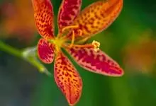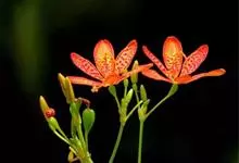 射干 Redouté)是鸢尾科射干属多年生草本植物。根状茎为不规则的块状,斜黄色或黄褐色;花橙红色,散生紫褐色的斑点;花药呈条形;子房下位,倒卵形;蒴果倒卵形或长椭圆形;种子圆球形,黑紫色,有光泽。…全部>>