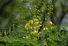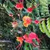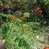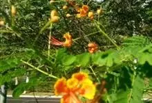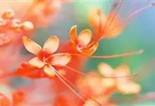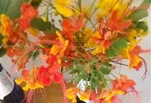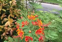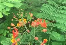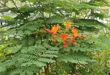 洋金凤 Sw.),豆科小凤花属灌木状或小乔木植物,枝无毛,绿或粉绿色;二回羽状复叶;总状花序伞房状,萼片无毛,花瓣橙红或黄色,圆形,花丝红色,子房无毛,花柱橙黄色;荚果窄而薄,…全部>>