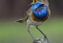 蓝点颏亦称“蓝喉歌鸲”,通称蓝靛颏儿。身体大小和麻雀相似,体长12-13厘米,体重17-18克。头部、上体主要为土褐色。眉纹白色。尾羽黑褐色,基部栗红色。颏部、喉部辉蓝色,下面有黑色横纹。下体白色。…全部>>