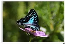 青带凤蝶Graphium sarpedon ,又名青凤蝶,是最普遍的中型凤蝶,飞行速度很快。青带凤蝶的翅膀中央有许多浅蓝色的斑点,很整齐地排列成一条直线。这些斑点由上而下逐渐变大,就像一条青色的带子。全部>>