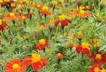 万寿菊是菊科万寿菊属一年生草本植物,别名孔雀菊、缎子花、臭菊花、西番菊、红黄草、小万寿菊、臭芙蓉、孔雀草。万寿菊茎近基部分枝。叶羽状分裂,长5-10厘米,宽4-8厘米,裂片长椭圆形或披针形,具锐齿,…全部>>