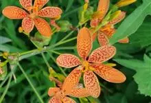 射干 Redouté)是鸢尾科射干属多年生草本植物。根状茎为不规则的块状,斜黄色或黄褐色;花橙红色,散生紫褐色的斑点;花药呈条形;子房下位,倒卵形;蒴果倒卵形或长椭圆形;种子圆球形,黑紫色,有光泽。…全部>>