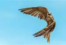 苍鹰是中小型猛禽。体长可达60厘米,翼展约1.3米。头顶、枕和头侧黑褐色,枕部有白羽尖,眉纹白杂黑纹;背部棕黑色;胸以下密布灰褐和白相间横纹;尾灰褐,有4条宽阔黑色横斑,尾方形。飞行时,双翅宽阔,…全部>>