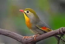 银耳相思鸟小型鸟类,体长14~18厘米。头顶黑色,耳羽银灰色,前额橙黄色;外侧飞羽橙黄色,基部朱红色,极为鲜艳、醒目。尾圆形,尾上、尾下覆羽朱红色,尾暗灰褐色,外侧尾羽橙黄色,其余上体橄榄绿或橄榄黄色。…全部>>
