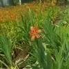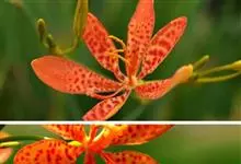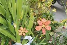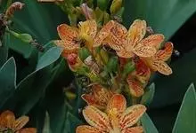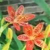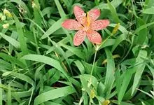 射干 Redouté)是鸢尾科射干属多年生草本植物。根状茎为不规则的块状,斜黄色或黄褐色;花橙红色,散生紫褐色的斑点;花药呈条形;子房下位,倒卵形;蒴果倒卵形或长椭圆形;种子圆球形,黑紫色,有光泽。…全部>>
