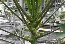 番木瓜,番木瓜科番木瓜属的常绿软木质小乔木,高达10米,具有乳汁;茎不分枝或有时于损伤处分枝;叶大且聚生于茎顶,近似盾形,叶柄中空;花单性或两性,有些品种雄株偶尔生两性花或雌花,…全部>>