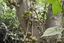 大果榕是桑科榕属的小乔木,株高可达10米;幼枝被柔毛;叶互生,宽卵状心形或近圆形;雄花无梗、匙形、花丝长,雌花生于雌株榕果内,子房白色;榕果簇生于树干基部或老茎短枝上、扁球形或陀螺形,…全部>>
