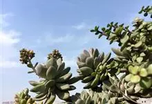 仙女之舞是景天科、伽蓝菜属植物。常绿肉质灌木,株高可达2-3米。幼株茎上有毛。叶有柄;单叶对生,阔卵状三角形,肉质;新叶开展,老叶正面凹、背面圆凸,缘具稀锯齿,橄榄绿色至灰绿色,被稠密的灰白色毛。…全部>>