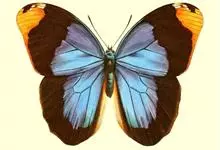 天堂凤蝶翅展可达105mm。前、后翅自基角至后缘约1/2~2/3端为纯净的宝蓝色,后角至后缘1/3~1/2端为黑色,后翅有黑色的尾突。翅背面为棕褐色。全部>>