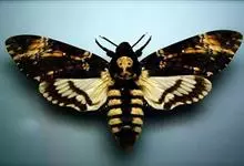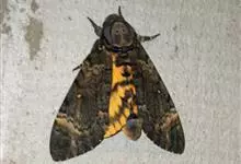 鬼脸天蛾,是鳞翅目天蛾科面形天蛾属动物。成虫翅展100~125毫米,体黑褐色;胸背有骷髅形斑纹;卵圆球形,直径约2毫米,淡黄绿色,表面光滑;老熟幼虫体长70~90毫米,蛹体长约56毫米;前翅为褐色,…全部>>