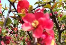 贴梗海棠Nakai)是蔷薇科、木瓜海棠属植物。落叶灌木,高达2米,枝条直立开展,有刺。叶片卵形至椭圆形,稀长椭圆形,长3-9厘米,宽1.5-5厘米。花先叶开放,3-5朵簇生于二年生老枝上。…全部>>