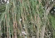 木麻黄是木麻黄科木麻黄属常绿乔木。高可达30米,树皮暗褐色,狭长形条片状脱落;小枝细长,为灰绿色;花雌雄同株或异株,雄蕊黄褐色,雌蕊紫红色;果序为椭圆形球果状。花期4—5月,果期7—10月。…全部>>