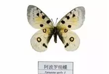 阿波罗绢蝶:翅展约7-8.4厘米。前翅较圆,白垩色,翅表有许多黑点、灰白斑及无鳞透明区,这些斑点的形状、密度及其强度常随产地的不同而有所变化,但后翅通常总有显著的鲜红色斑点。触角主干灰白色,…全部>>