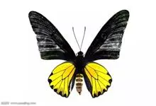 金裳凤蝶是凤蝶科、裳凤蝶属的动物。金裳凤蝶身体呈黑色,头、颈和胸侧有红毛,腹部有黑黄两色相间条纹,雄蝶前翅黑色,具黑天鹅绒光泽,各脉两侧灰白色,后翅金黄色,各室外缘有等腰三角形黑斑1枚,斑内侧有晕,…全部>>