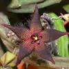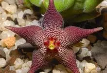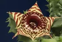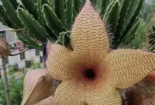 巨花犀角又称大豹皮花,是夹竹桃科犀角属的一种植物。茎粗,花大,边缘生长细毛。植株柱形多分枝呈丛生,柱形具4棱,棱缘具细小疣突。花大,五角星形黄色,并有横向棕褐色斑纹,似豹皮而得名。花期夏秋两季。…全部>>