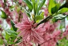 菊花桃是蔷薇科、桃属落叶灌木或小乔木,树干灰褐色,小枝细长,无毛,有光泽,绿色,向阳处转变成红色,冬芽圆锥形,常个簇生,中间为叶芽,两侧为花芽。叶片椭圆状披针形。花生于叶腋,粉红色或红色,重瓣,…全部>>