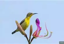 黑胸太阳鸟:小型鸟类,体长9-15厘米。嘴细长而向下曲。雄鸟中央尾羽特长,尾呈楔形,头顶至后颈紫蓝色具金属光泽;背褐红色,腰有一黄色横带,尾上覆羽和尾紫蓝色;颏、喉和上胸乌黑色,有的下胸为硫黄色,…全部>>