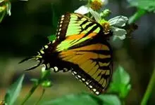 金凤蝶,是鳞翅目凤蝶科凤蝶属动物。金凤蝶为中型凤蝶,翅展70-84毫米,翅背面底色黑褐色,翅脉黑色,翅室具黄斑;前翅背面基部呈暗黄色,亚外缘为黑色,内具一列小黄斑;后翅背面亚外缘区具黑宽边,…全部>>