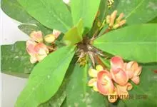 虎刺梅:别称铁海棠,是蔓生灌木植物。茎多分枝,长60-100厘米,直径5-10毫米,具纵棱,密生硬而尖的锥状刺,刺长1-1.5厘米,直径0.5-1.0 毫米,常呈3-5列排列于棱脊上,呈旋转。叶互生…全部>>