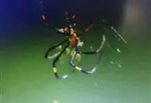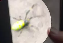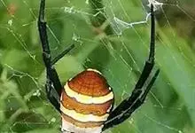 棒络新妇,是蜘蛛目肖蛸科络新妇属节肢动物。雄蛛体长约6毫米,背甲褐色,具黑色纵斑;步足黑色,有橙色环纹;腹部筒形、褐色,有黄斑;雌蛛体长约21毫米,背甲黑色,有大量银色长毛;触肢黄色,步足黑色,…全部>>