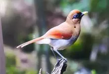 棕噪鹛中型鸟类,体长25~28厘米。上体赭褐色,头顶具黑色羽缘,尾上覆羽灰白色,尾羽棕栗色,外侧尾羽具宽阔的白色端斑。额、眼先、眼周、耳羽上部、脸前部和颏黑色,眼周裸皮蓝色,极为醒目。喉和上胸与背同色,…全部>>
