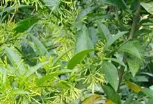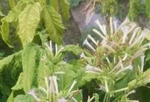 夜香树是茄科、夜香树属直立或近攀援状灌木。枝条细长而下垂。叶有短柄,叶片矩圆状卵形或矩圆状披针形,全缘,顶端渐尖,基部近圆形或宽楔形,两面秃净而发亮,有6-7对侧脉。伞房式聚伞花序,腋生或顶生,…全部>>