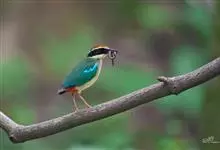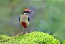 绿胸八色鸫:是雀形目八色鸫科的鸟类,共有12个亚种。体长为16-18厘米,体重65-69克。体型圆胖,尾短,腿长。头黑,上体绿色,两翼深色而具白色斑纹,头顶至后枕深褐,胸及腹部苹果绿,臀亮红。…全部>>