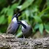 黑喉噪鹛是噪鹛属鸟类。体长24-29厘米,体重75-90克。雄鸟前额、眼先、眼周和眼后纹以及颊、须和喉黑色;黑色前额和蓝灰色头顶之间有道白色细斑;颈侧具椭圆形白斑,…全部>>