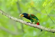 黑眉拟啄木鸟,为须䴕科、拟啄木鸟属的小型鸟类,体长20-25厘米,外形和金喉拟啄木鸟非常相似,但具粗著的黑色眉纹,头侧和耳覆羽以及下喉蓝色而不为银灰色,前颈两侧各有一块鲜红色斑。全部>>
