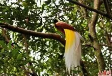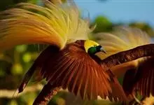 大极乐鸟是极乐鸟属中最大的鸟种。成年雄鸟体长可达到43厘米,雌性可达35厘米。雄鸟的额、颊、喉等墨绿色;头、颈黄色;上体暗赤栗色;腹部葡萄红色,胁部有长饰羽,其基部橙黄,中部黄色,…全部>>