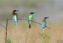 栗喉蜂虎是蜂虎科蜂虎属的鸟类。有热带鸟类羽毛艳丽的特征:喉部是栗红色的,黑色的过眼纹,翅膀和背部是绿色的,尾翼是蓝色的,飞行时翅膀下面的羽毛是橙黄色的,在阳光的照射下,它们全身闪烁着金属般的艳丽光泽,…全部>>