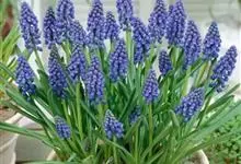葡萄风信子,是天门冬科蓝壶花属的多年生草本优良观花地被植物,为小型花卉球根植物。根具鳞茎,卵形或近球形,株高5-10cm;基生叶半圆柱状线形;花葶不分枝,总状花序,长椭圆状柱形;花深蓝色,近球形,坛状,…全部>>