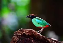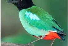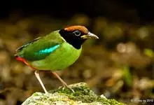 绿胸八色鸫:是雀形目八色鸫科的鸟类,共有12个亚种。体长为16-18厘米,体重65-69克。体型圆胖,尾短,腿长。头黑,上体绿色,两翼深色而具白色斑纹,头顶至后枕深褐,胸及腹部苹果绿,臀亮红。…全部>>