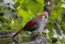 赤尾噪鹛中型鸟类,体长24~28厘米。头顶至后颈红棕色,两翅和尾鲜红色,眼先、眉纹、颊、颏和喉黑色,眼后有一灰色块斑。其余上下体羽大都暗灰或橄榄灰色。特征极明显,特别是通过鲜红色的头顶、翅和尾。…全部>>