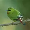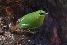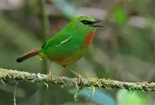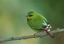 火尾绿鹛是莺科、绿鹛属小型鸟类,体长11-14厘米。上体绿色,头顶至枕具黑色鳞状斑,眼先和眼后黑色,眉纹黄绿色。两翅黑色具黄色和红色翅斑及白色端斑,极为醒目。中央一对尾羽绿色,外侧尾羽鲜红色。…全部>>