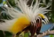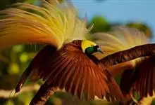 大极乐鸟是极乐鸟属中最大的鸟种。成年雄鸟体长可达到43厘米,雌性可达35厘米。雄鸟的额、颊、喉等墨绿色;头、颈黄色;上体暗赤栗色;腹部葡萄红色,胁部有长饰羽,其基部橙黄,中部黄色,…全部>>