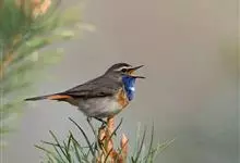 蓝点颏亦称“蓝喉歌鸲”,通称蓝靛颏儿。身体大小和麻雀相似,体长12-13厘米,体重17-18克。头部、上体主要为土褐色。眉纹白色。尾羽黑褐色,基部栗红色。颏部、喉部辉蓝色,下面有黑色横纹。下体白色。…全部>>