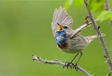 蓝点颏亦称“蓝喉歌鸲”,通称蓝靛颏儿。身体大小和麻雀相似,体长12-13厘米,体重17-18克。头部、上体主要为土褐色。眉纹白色。尾羽黑褐色,基部栗红色。颏部、喉部辉蓝色,下面有黑色横纹。下体白色。…全部>>