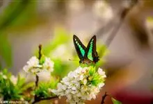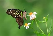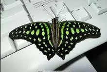 青带凤蝶Graphium sarpedon ,又名青凤蝶,是最普遍的中型凤蝶,飞行速度很快。青带凤蝶的翅膀中央有许多浅蓝色的斑点,很整齐地排列成一条直线。这些斑点由上而下逐渐变大,就像一条青色的带子。全部>>
