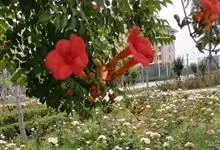 凌霄 Schum.),别名上树龙、五爪龙、九龙下海等,为紫葳科凌霄属的攀援藤本植物。其茎木质,以气生根攀附于它物之上。叶对生,为奇数羽状复叶;小叶卵形至卵状披针形,边缘有粗锯齿;顶生疏散的短圆锥花序,…全部>>