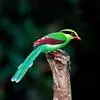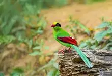 蓝绿鹊:中型鸟类,共有5个亚种。体长36-38厘米。尾长,嘴、脚红色。通体羽色主要为草绿色,宽阔的黑色贯眼纹向后延伸到后颈,在绿色的头侧极为醒目。两翅栗红色,内侧飞羽具黑色次端斑和白色尖端。尾绿色,…全部>>