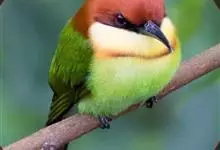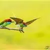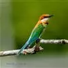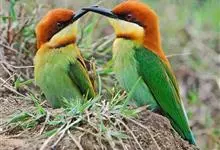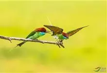 栗喉蜂虎是蜂虎科蜂虎属的鸟类。有热带鸟类羽毛艳丽的特征:喉部是栗红色的,黑色的过眼纹,翅膀和背部是绿色的,尾翼是蓝色的,飞行时翅膀下面的羽毛是橙黄色的,在阳光的照射下,它们全身闪烁着金属般的艳丽光泽,…全部>>